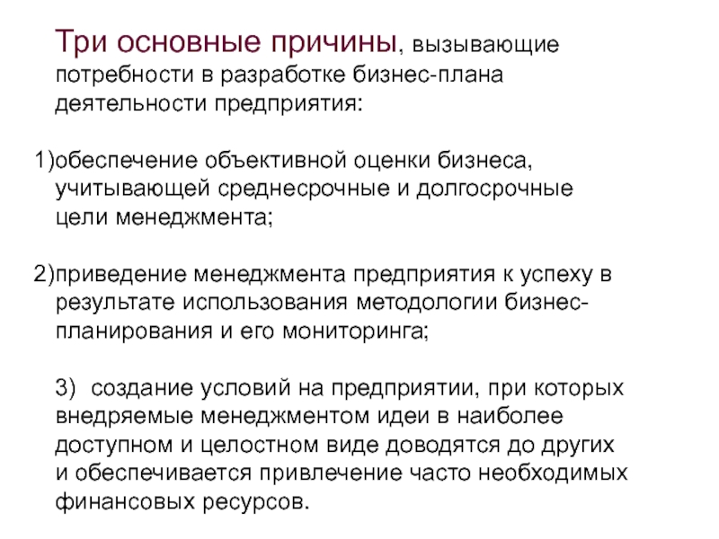 Слайд 16Три основные причины, вызывающие потребности в разработке бизнес-плана деятельности предприятия: