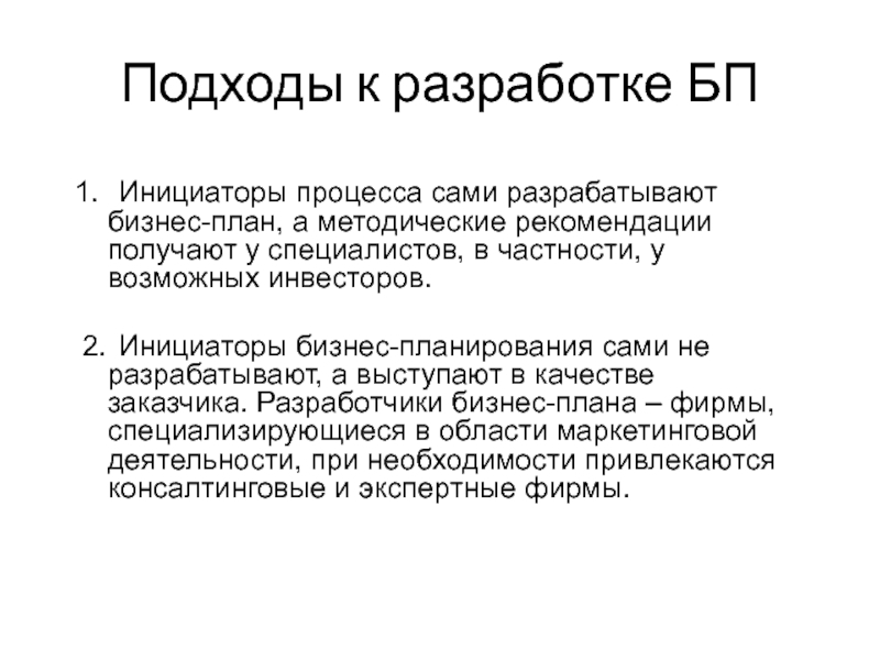 разрабатывают, а выступают в качестве заказчика. Разработчики бизнес-плана – фирмы, специализирующиеся в области маркетинговой деятельности, при необходимости привлекаются консалтинговые и экспертные фирмы.