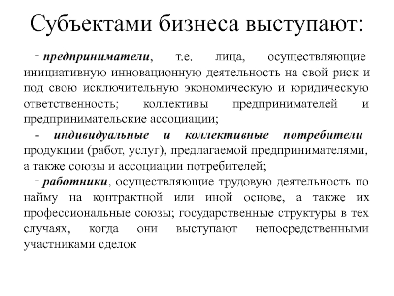 ‑ работники, осуществляющие трудовую деятельность по найму на контрактной или иной основе, а также их профессиональные союзы; государственные структуры в тех случаях, когда они выступают непосредственными участниками сделок