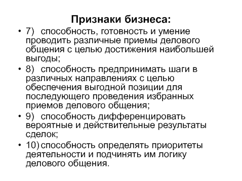 10) способность определять приоритеты деятельности и подчинять им логику делового общения.