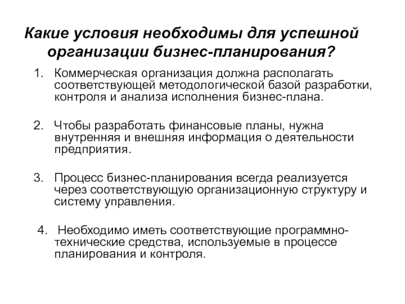 Слайд 23Какие условия необходимы для успешной организации бизнес-планирования?