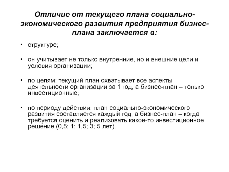 Слайд 36Отличие от текущего плана социально-экономического развития предприятия бизнес-плана заключается в: