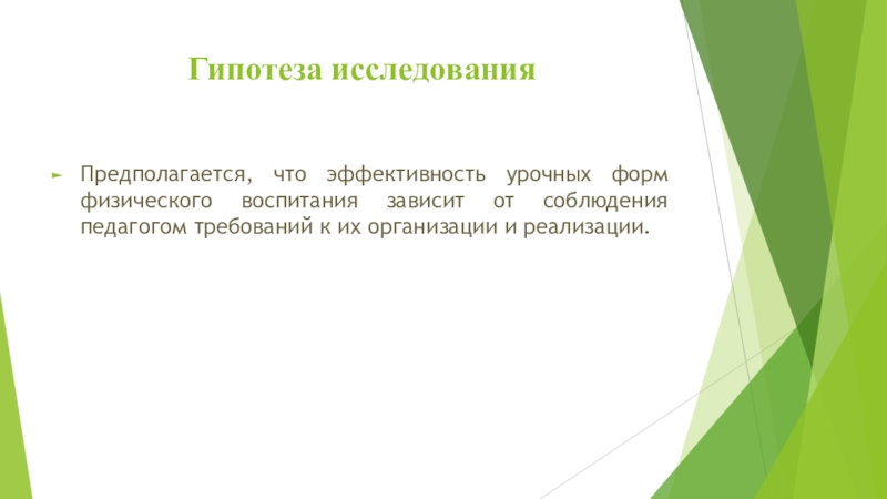 Гипотеза исследованияПредполагается, что эффективность урочных форм физического воспитания зависит от соблюдения педагогом требований к их организации и