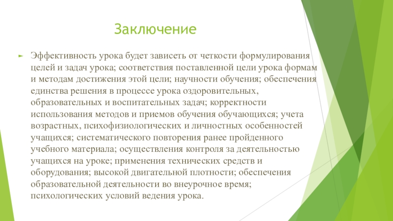 ЗаключениеЭффективность урока будет зависеть от четкости формулирования целей и задач урока; соответствия поставленной цели урока формам и
