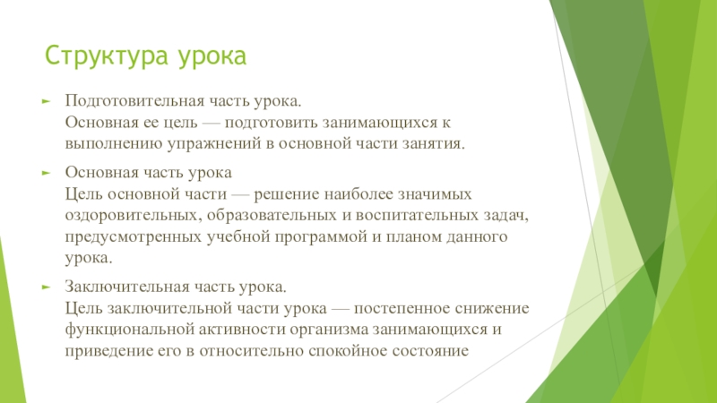 Структура урокаПодготовительная часть урока. Основная ее цель — подготовить занимающихся к выполнению упражнений в основной части занятия.Основная