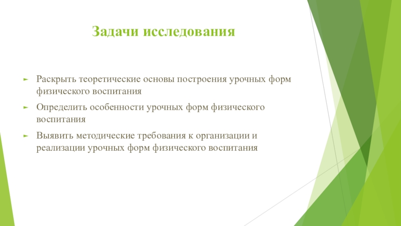 Задачи исследованияРаскрыть теоретические основы построения урочных форм физического воспитания Определить особенности урочных форм физического воспитанияВыявить методические требования