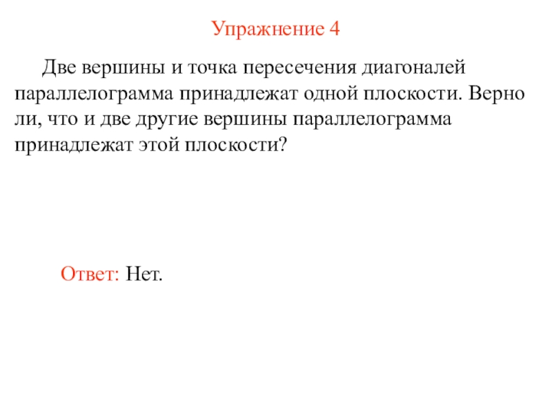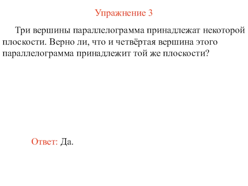 Три вершины параллелограмма принадлежат некоторой плоскости. Верно ли, что