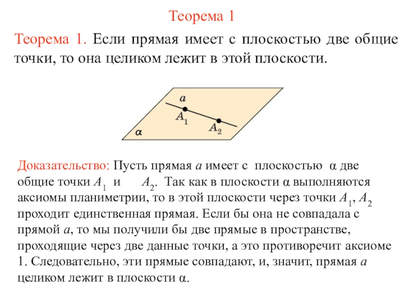прямая a имеет с плоскостью α две общие точки А1 и А2. Так как в плоскости α выполняются аксиомы планиметрии, то в этой плоскости через точки A1, A2 проходит единственная прямая. Если бы она не совпадала с прямой а, то мы получили бы две прямые в пространстве, проходящие через две данные точки, а это противоречит аксиоме 1. Следовательно, эти прямые совпадают, и, значит, прямая а целиком лежит в плоскости α.