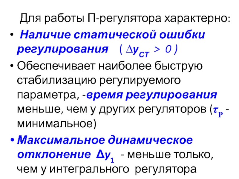 Максимальное динамическое отклонение Δy1 - меньше только, чем у интегрального регулятора