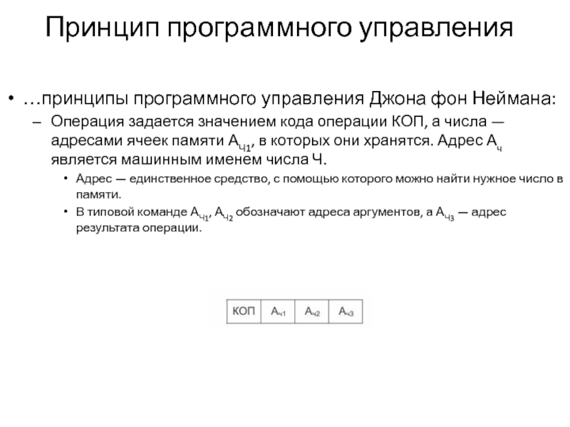 кода операции КОП, а числа — адресами ячеек памяти АЧ1,