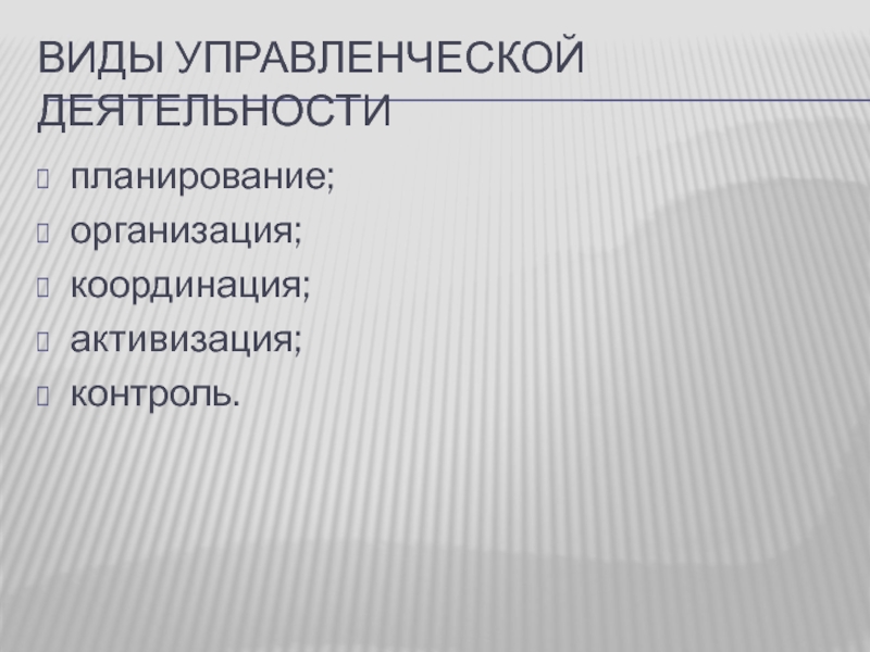 виды управленческой деятельностипланирование;организация;координация;активизация;контроль.