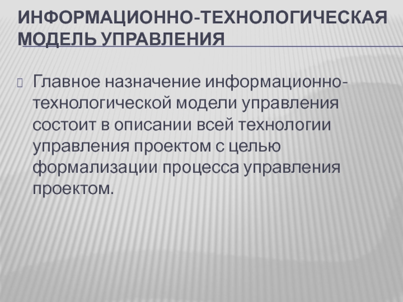 ИНФОРМАЦИОННО-ТЕХНОЛОГИЧЕСКАЯ МОДЕЛЬ УПРАВЛЕНИЯ Главное назначение информационно-технологической модели управления состоит в описании всей технологии управления проектом с целью