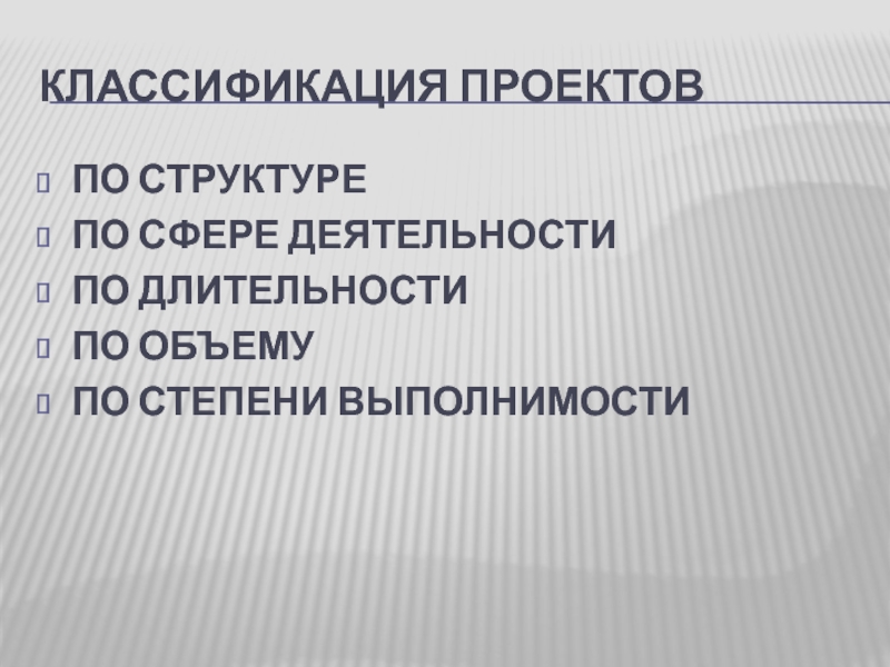 КЛАССИФИКАЦИЯ ПРОЕКТОВПО СТРУКТУРЕПО СФЕРЕ ДЕЯТЕЛЬНОСТИПО ДЛИТЕЛЬНОСТИПО ОБЪЕМУПО СТЕПЕНИ ВЫПОЛНИМОСТИ
