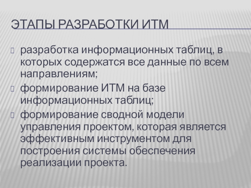 этапы разработки ИТМразработка информационных таблиц, в которых содержатся все данные по всем направлениям;формирование ИТМ на базе информационных