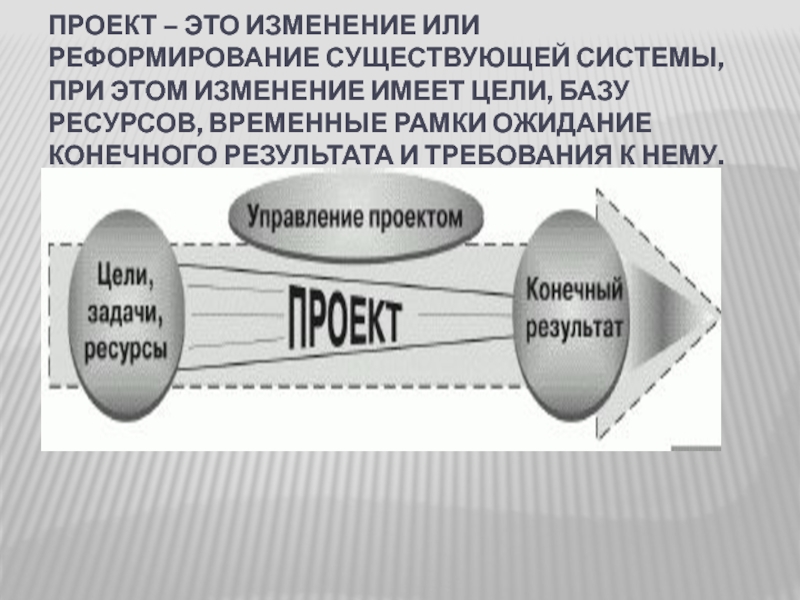 Слайд 2Проект – это изменение или реформирование существующей системы, при этом