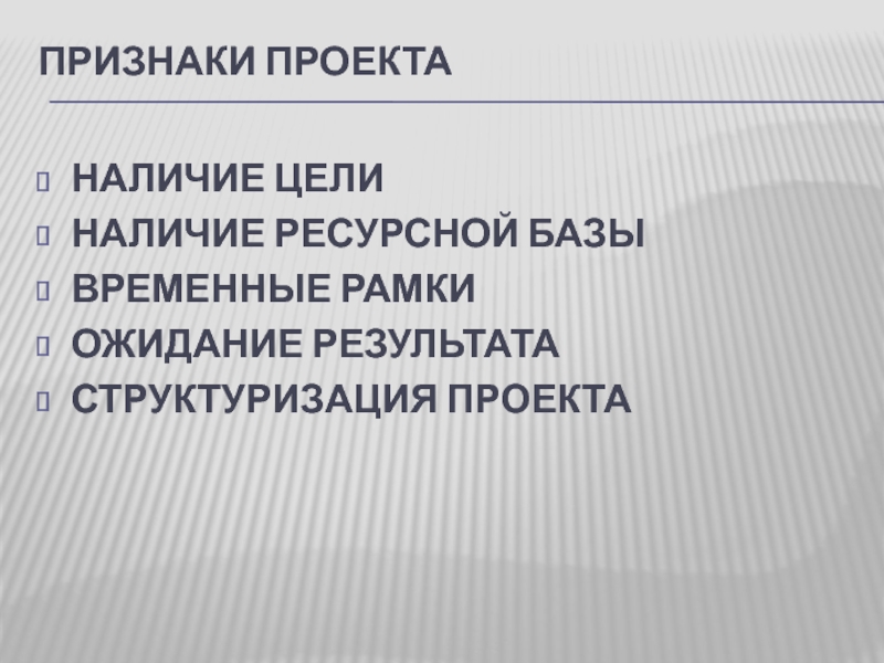 ПРИЗНАКИ ПРОЕКТА НАЛИЧИЕ ЦЕЛИНАЛИЧИЕ РЕСУРСНОЙ БАЗЫВРЕМЕННЫЕ РАМКИОЖИДАНИЕ РЕЗУЛЬТАТАСТРУКТУРИЗАЦИЯ ПРОЕКТА