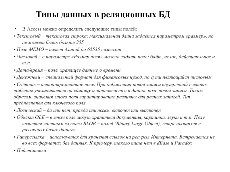 • Гиперссылка – используется для хранения ссылок на ресурсы Интернета. Встречается не во всех форматах баз данных. К примеру, такого типа нет в dBase и Paradox