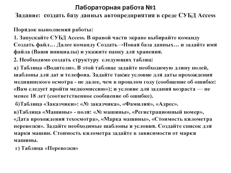 Задание: cоздать базу данных автопредприятия в среде СУБД