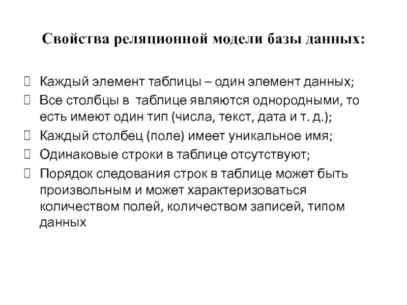 Порядок следования строк в таблице может быть произвольным и может характеризоваться количеством полей, количеством записей, типом данных
