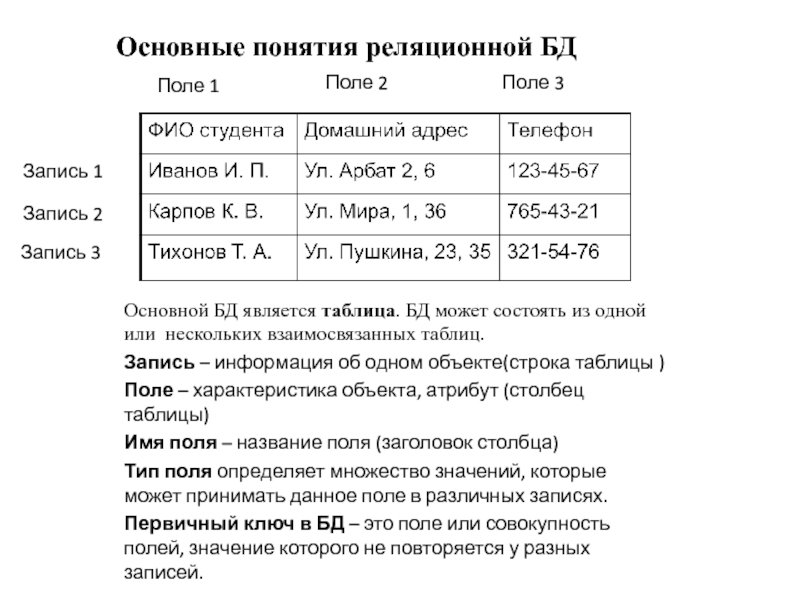 Первичный ключ в БД – это поле или совокупность полей, значение которого не повторяется у разных записей.