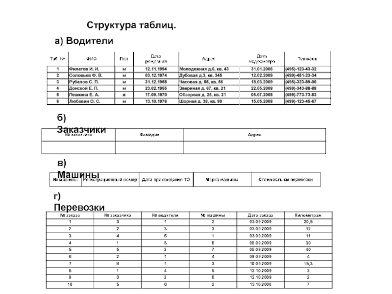 б)Таблица «Заказчики»: «№ заказчика», «Фамилия», «Адрес».