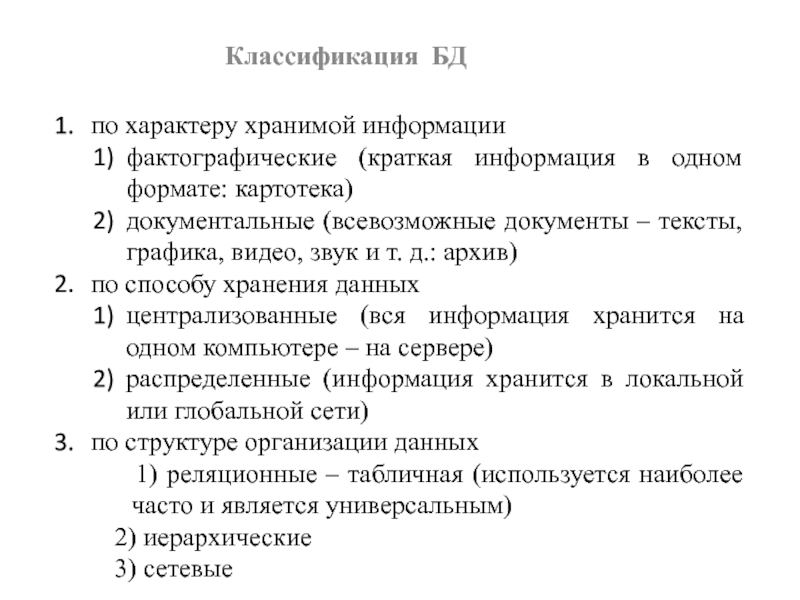 1) реляционные – табличная (используется наиболее часто и является универсальным)