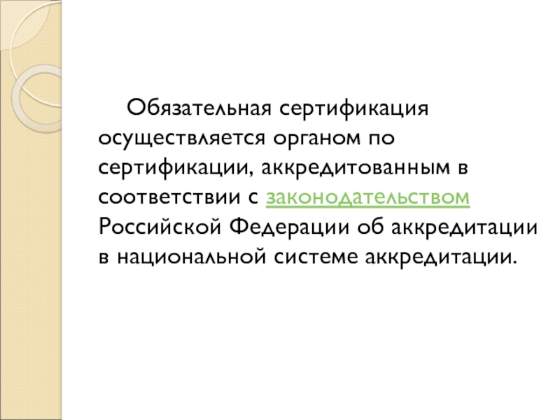 Слайд 63Обязательная сертификация осуществляется органом по сертификации, аккредитованным в соответствии с