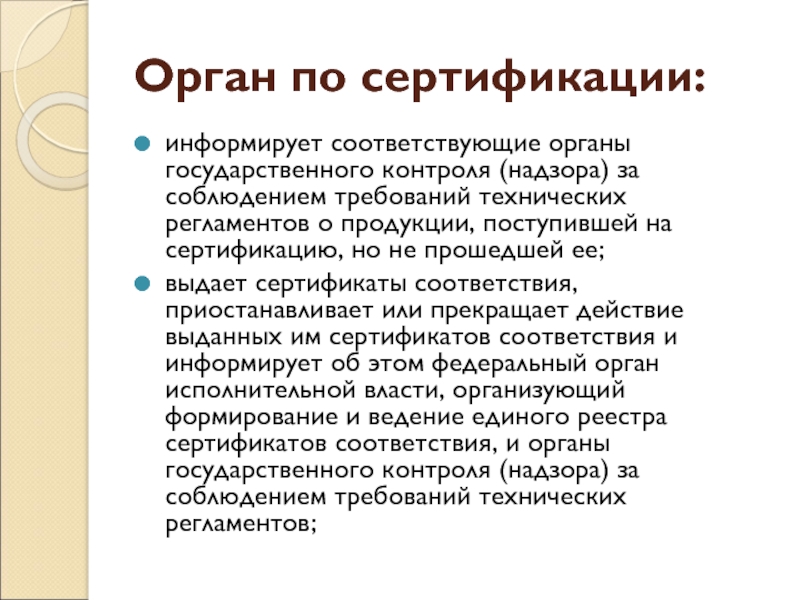 выдает сертификаты соответствия, приостанавливает или прекращает действие выданных им сертификатов соответствия и информирует об этом федеральный орган исполнительной власти, организующий формирование и ведение единого реестра сертификатов соответствия, и органы государственного контроля (надзора) за соблюдением требований технических регламентов;