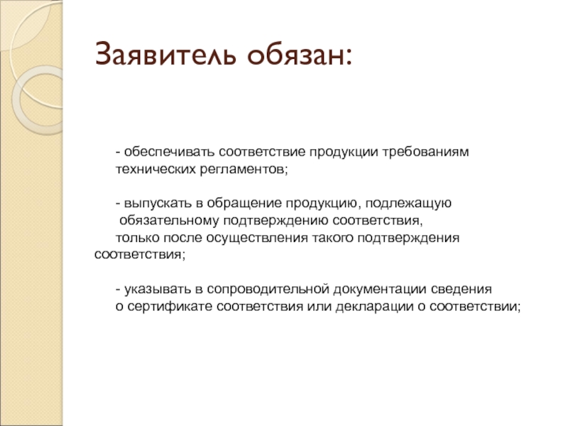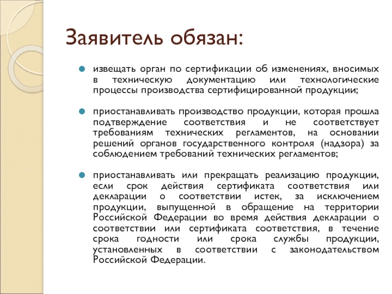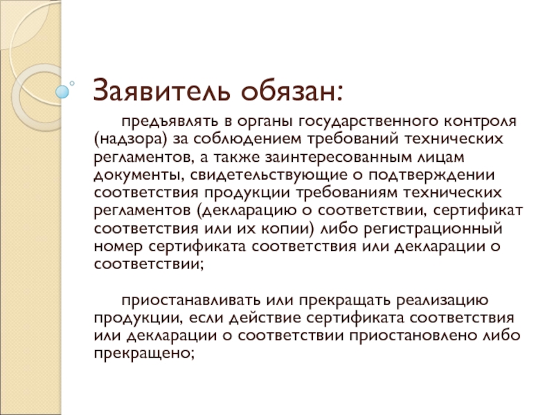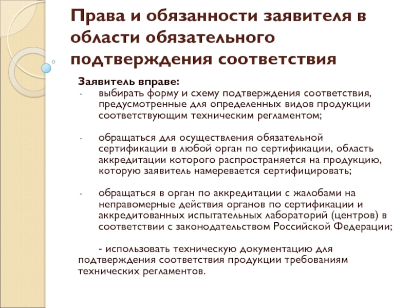 Слайд 73Права и обязанности заявителя в области обязательного подтверждения соответствия