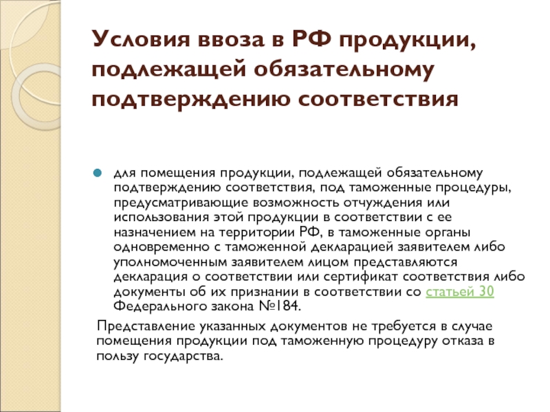 Слайд 77Условия ввоза в РФ продукции, подлежащей обязательному подтверждению соответствия