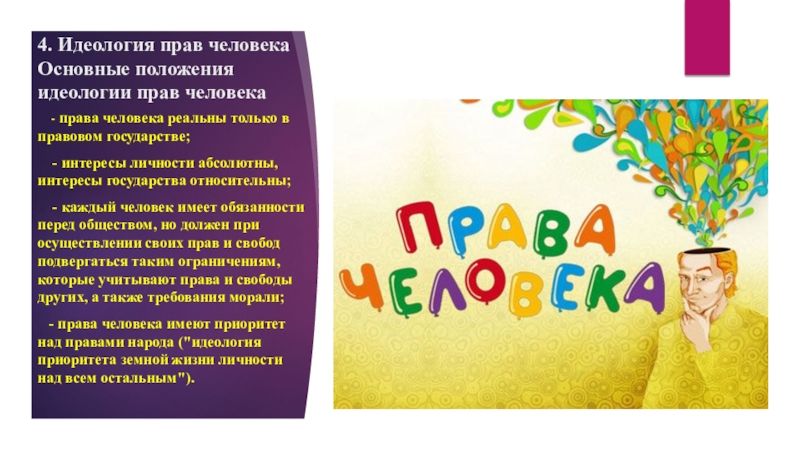 - права человека имеют приоритет над правами народа ("идеология приоритета земной жизни личности над всем остальным").