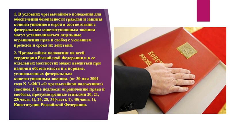 2. Чрезвычайное положение на всей территории Российской Федерации и в ее отдельных местностях может вводиться при наличии обстоятельств и в порядке, установленных федеральным конституционным законом. (от 30 мая 2001 года N 3-ФКЗ «О чрезвычайном положении») законом. 3. Не подлежат ограничению права и свободы, предусмотренные статьями 20, 21, 23(часть 1), 24, 28, 34(часть 1), 40(часть 1), Конституции Российской Федерации.