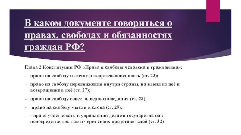 Слайд 5В каком документе говориться о правах, свободах и обязанностях граждан