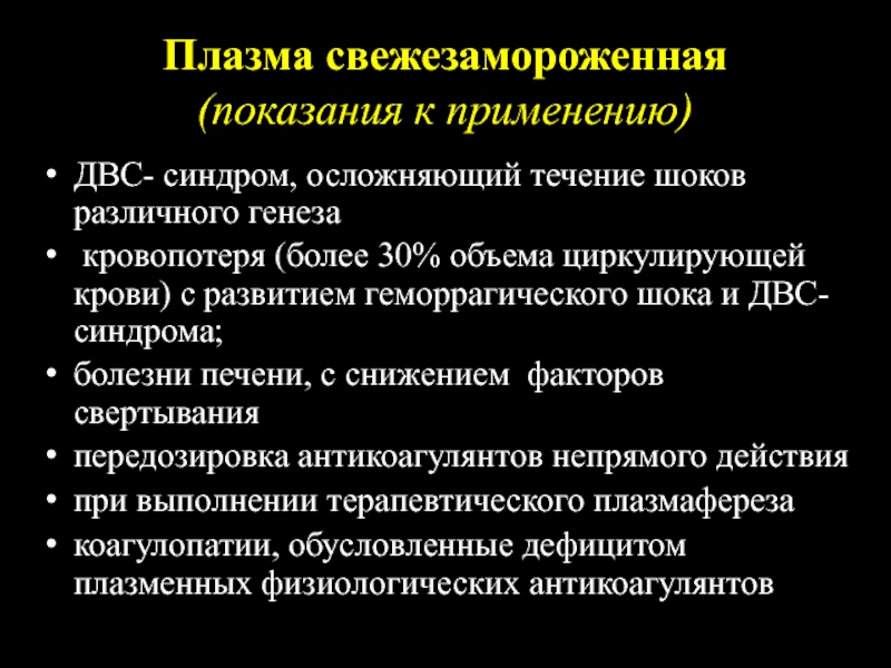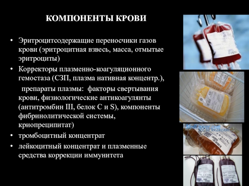 крови, физиологические антикоагулянты (антитромбин III, белок С и S), компоненты фибринолитической системы, криопреципитат)