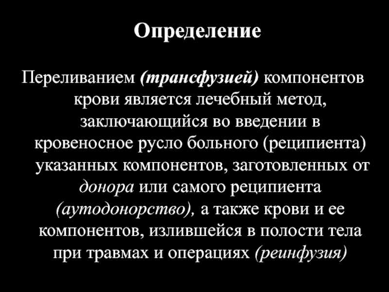 или самого реципиента (аутодонорство), а также крови и ее компонентов, излившейся в полости тела при травмах и операциях (реинфузия)