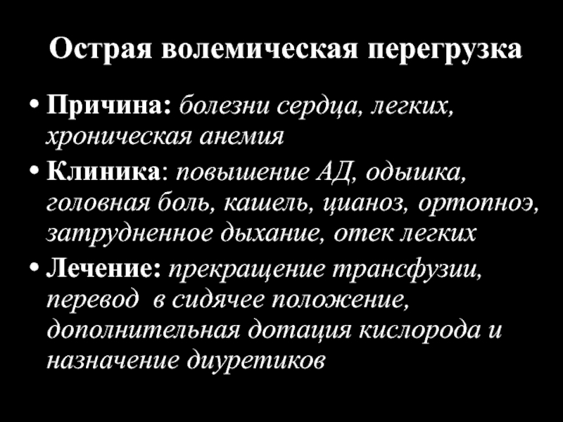 Лечение: прекращение трансфузии, перевод в сидячее положение, дополнительная дотация кислорода и назначение диуретиков