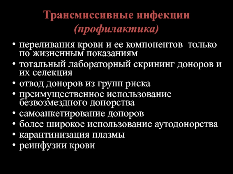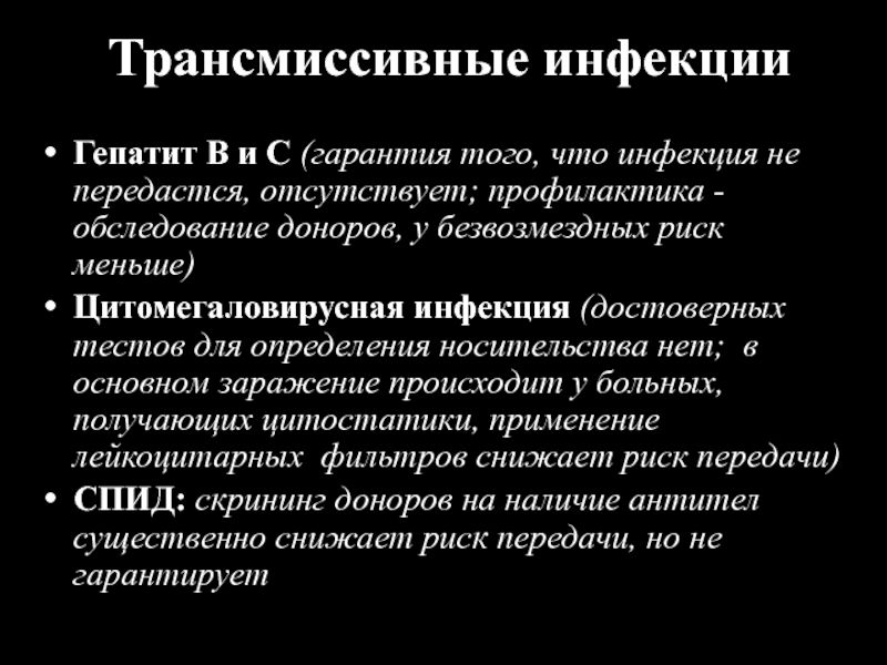 Цитомегаловирусная инфекция (достоверных тестов для определения носительства нет; в основном заражение происходит у больных, получающих цитостатики, применение лейкоцитарных фильтров снижает риск передачи)