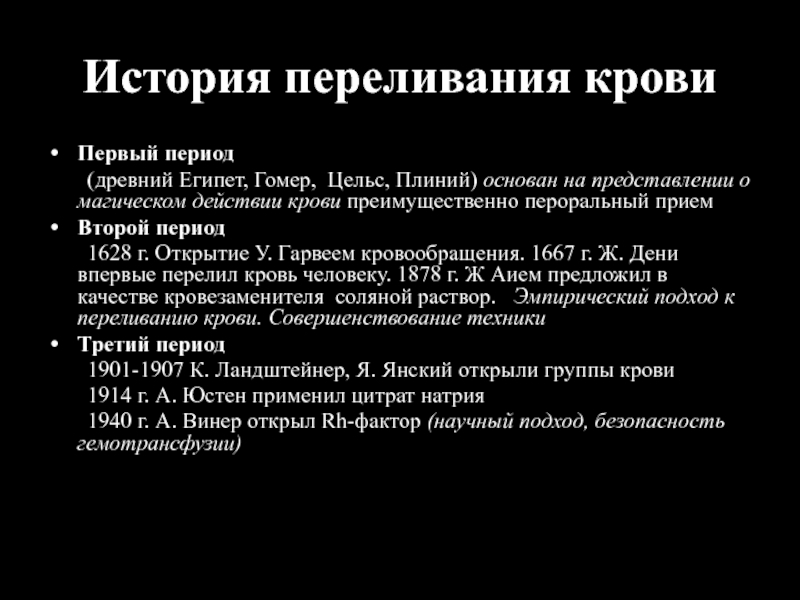 1628 г. Открытие У. Гарвеем кровообращения. 1667 г. Ж. Дени впервые перелил кровь человеку. 1878 г. Ж Аием предложил в качестве кровезаменителя соляной раствор. Эмпирический подход к переливанию крови. Совершенствование техники