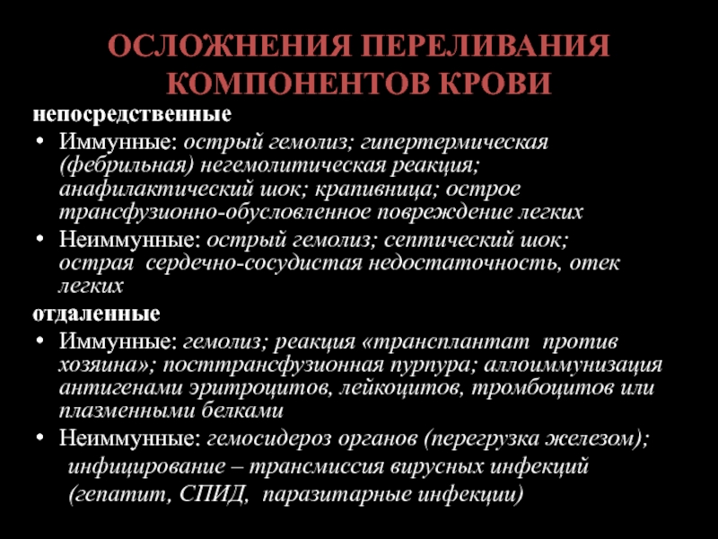 Слайд 39ОСЛОЖНЕНИЯ ПЕРЕЛИВАНИЯ КОМПОНЕНТОВ КРОВИ