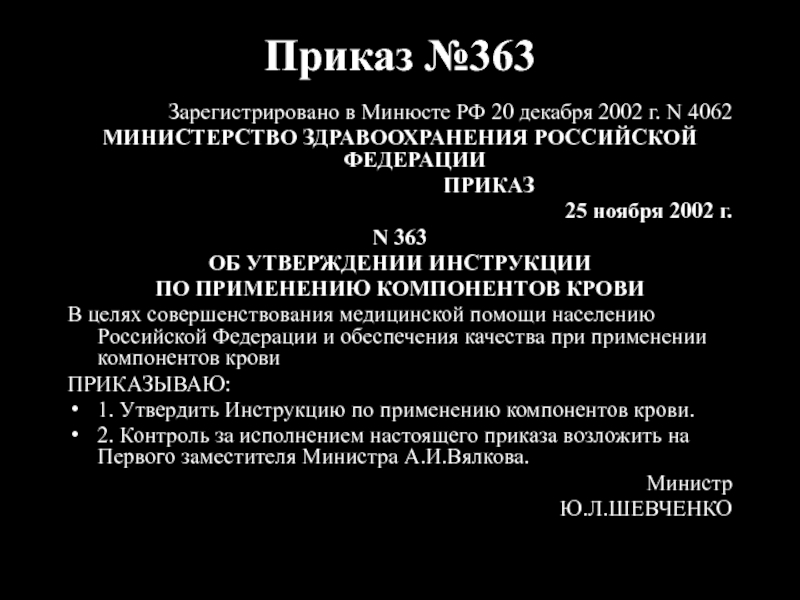 1. Утвердить Инструкцию по применению компонентов крови.