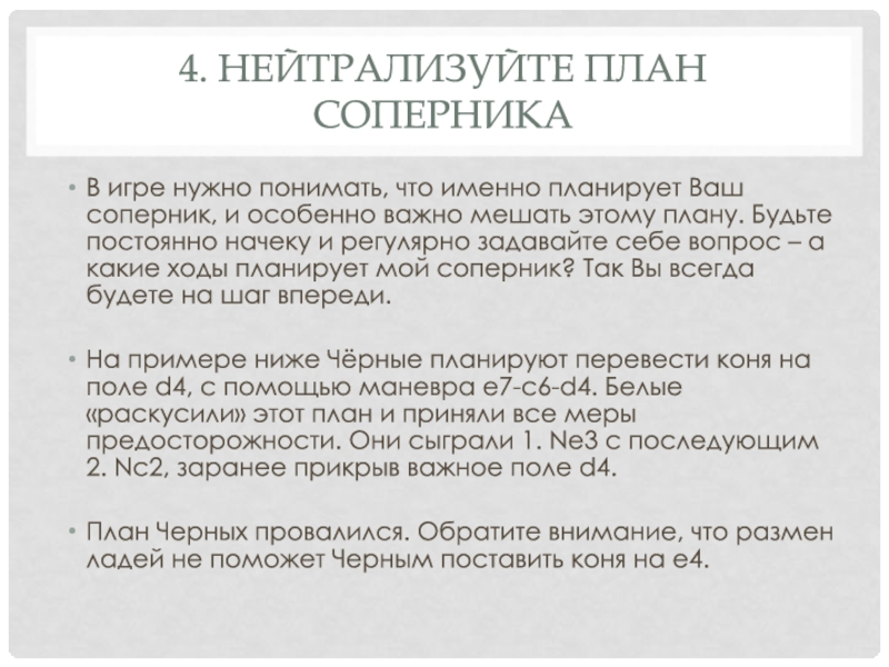 начеку и регулярно задавайте себе вопрос – а какие ходы планирует мой соперник? Так Вы всегда будете на шаг впереди.