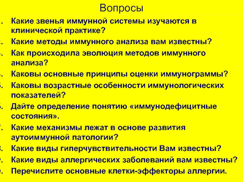 6. Постановку диагноза «иммунодефицитное состояние» и назначение адекватной иммунотерапии после проведения иммунологического обследования проводит только лечащий врач, а не врач –лаборант, который может лишь фиксировать изменения в отдельных звеньях иммунной системы.