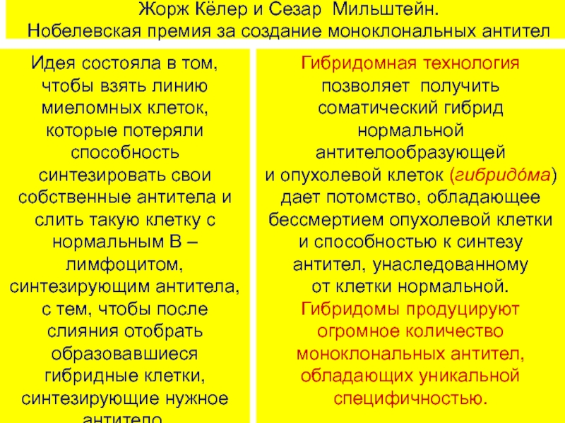 гибридомной технологии (Нобелевская премия 1984 года).