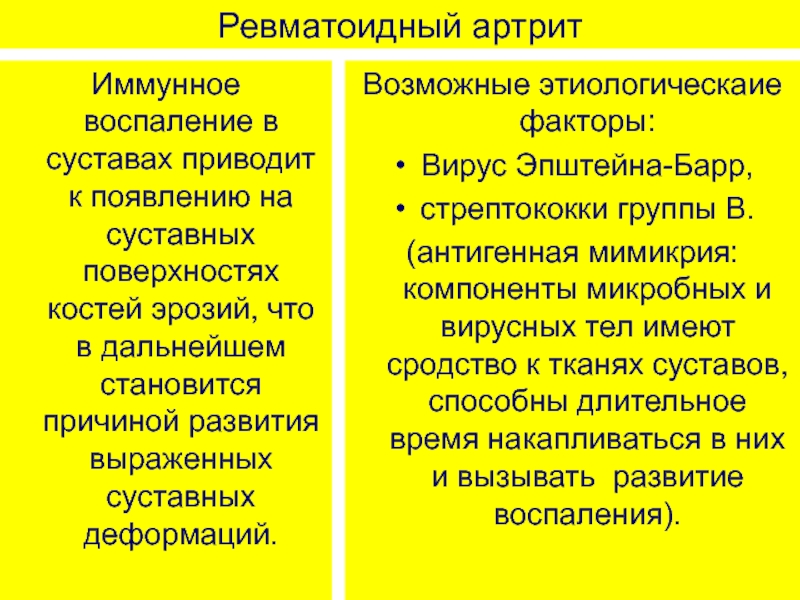 (антигенная мимикрия: компоненты микробных и вирусных тел имеют сродство к тканях суставов, способны длительное время накапливаться в них и вызывать развитие воспаления).