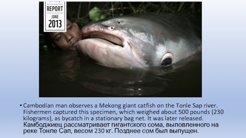 pounds (230 kilograms), as bycatch in a stationary bag net. It was later released. Камбоджиец рассматривает гигантского сома, выловленного на реке Тонле Сап, весом 230 кг. Позднее сом был выпущен.