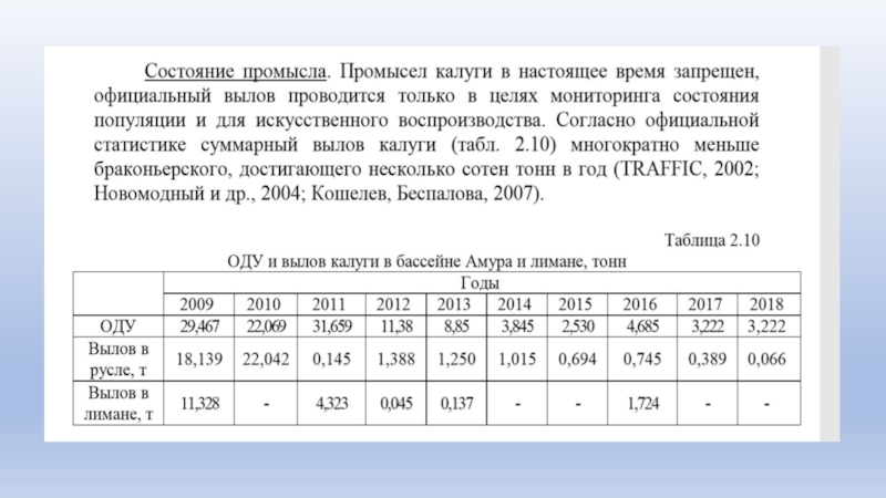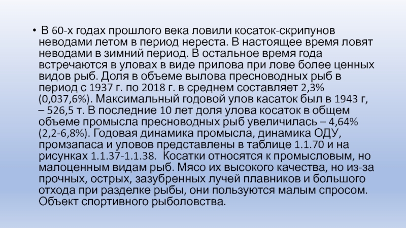 период. В остальное время года встречаются в уловах в виде прилова при лове более ценных видов рыб. Доля в объеме вылова пресноводных рыб в период с 1937 г. по 2018 г. в среднем составляет 2,3% (0,037,6%). Максимальный годовой улов касаток был в 1943 г, – 526,5 т. В последние 10 лет доля улова косаток в общем объеме промысла пресноводных рыб увеличилась – 4,64% (2,2-6,8%). Годовая динамика промысла, динамика ОДУ, промзапаса и уловов представлены в таблице 1.1.70 и на рисунках 1.1.37-1.1.38. Косатки относятся к промысловым, но малоценным видам рыб. Мясо их высокого качества, но из-за прочных, острых, зазубренных лучей плавников и большого отхода при разделке рыбы, они пользуются малым спросом. Объект спортивного рыболовства.