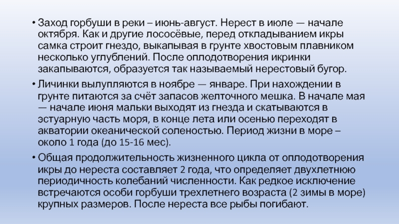 Слайд 13Заход горбуши в реки – июнь-август. Нерест в июле —