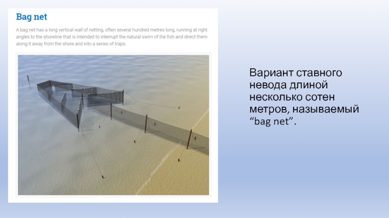 Слайд 98Вариант ставного невода длиной несколько сотен метров, называемый “bag net”.