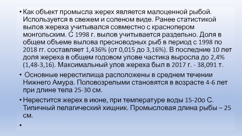 и соленом виде. Ранее статистикой вылов жереха учитывался совместно с