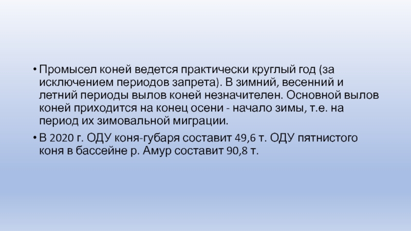 Слайд 67Промысел коней ведется практически круглый год (за исключением периодов запрета).